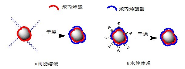 HT A20分子中的錨固部分由(甲基)丙烯酸、磷酸的均聚物或共聚物組成,通過和鈦白粉間的吸引力(配位作用、共價鍵)吸附在粒子表面,將粒子隔離開來。和樹脂相容的穩(wěn)定部分由丙烯酸酯、甲氧基聚丙二醇丙烯酸酯無規(guī)共聚物組成,賦予表面改性后的鈦白粉粒子良好的再分散性,并且能穩(wěn)定均勻分散在樹脂溶液和溶劑揮發(fā)后的樹脂中。在體系干燥過程中以及干燥后,和樹脂相容的部分能包覆在鈦白粉粒子表面,防止粒子聚集,使得鈦白粉粒子在樹脂中能均勻分散。圖2表示改性劑HT A20處理鈦白粉粒子后,HT A20在粒子表面的形態(tài)。圖2a表示在樹脂溶液或溶劑中,干燥前,改性劑的錨固部分和鈦白粉粒子間通過共價鍵、配位鍵結(jié)合在粒子表面上,聚丙烯酸酯部分充分伸展,通過空間位阻作用穩(wěn)定粒子;干燥后,聚丙烯酸酯部分包覆在粒子上或和樹脂基體互相滲透。圖2b表示在水性體系中,干燥前,改性劑的聚丙烯酸錨固部分和鈦白粉粒子間通過共價鍵、配位鍵結(jié)合在粒子表面上,依靠靜電斥力穩(wěn)定粒子;干燥后,聚丙烯酸酯部分包覆在粒子上或和樹脂互相滲透??梢姡p親型嵌段聚合物改性劑HT A20對鈦白粉進行有機表面處理后,在有機溶劑體系和水性體系中,都能提高鈦白粉在介質(zhì)中的分散穩(wěn)定性并改善鈦白粉和樹脂的相容性。